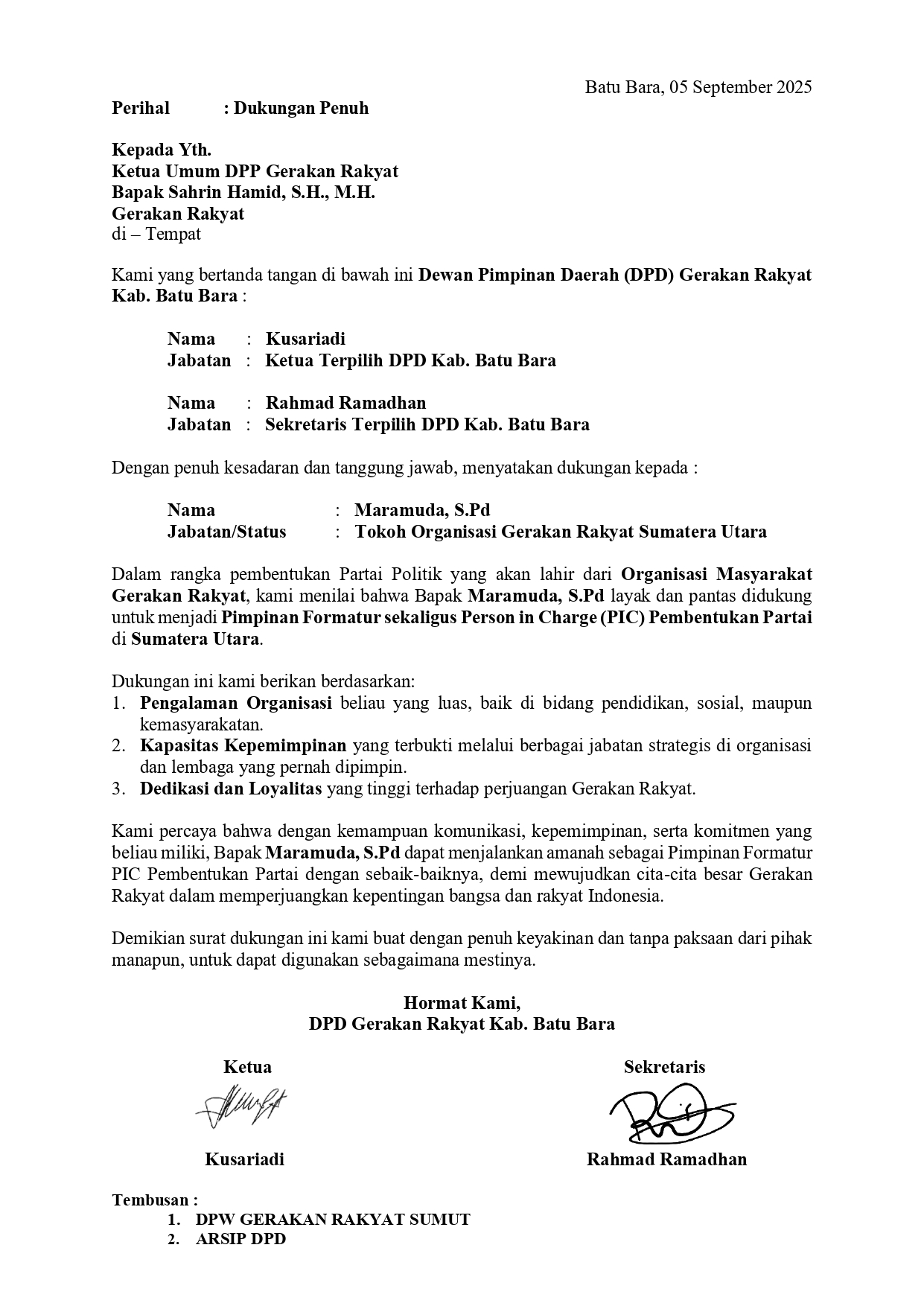 “Kami percaya Abangda Maramuda, S.Pd adalah sosok yang tepat untuk memimpin formatur dan memimpin partai ini nantinya. Beliau memiliki pengalaman, rekam jejak, serta visi perjuangan yang jelas untuk masyarakat,” tegas Ketua DPD Gerakan Rakyat Kabupaten Batu Bara.